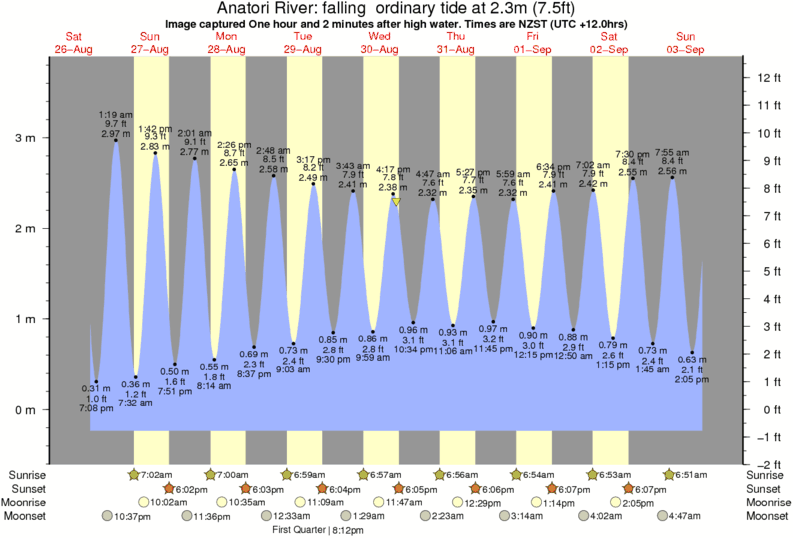 Image captured One hour and 2 minutes after high water (falling ordinary tide). Tide height was 2.3m (7.5 ft). Range 3.75m (12.3 ft). Toggle tide graph