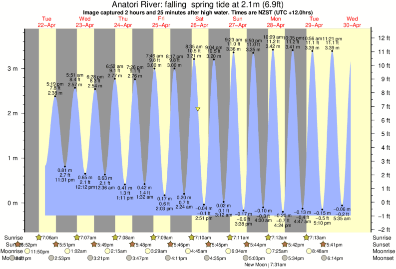 Image captured 2 hours and 25 minutes after high water (falling spring tide). Tide height was 2.1m (6.9 ft). Range 3.79m (12.4 ft). Toggle tide graph