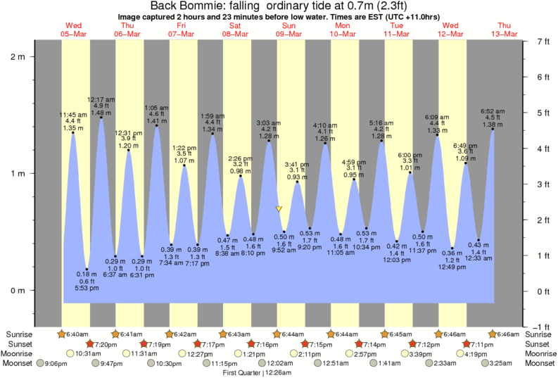 Image captured 2 hours and 23 minutes before low water (falling ordinary tide). Tide height was 0.7m (2.3 ft). Range 2.05m (6.7 ft). Toggle tide graph