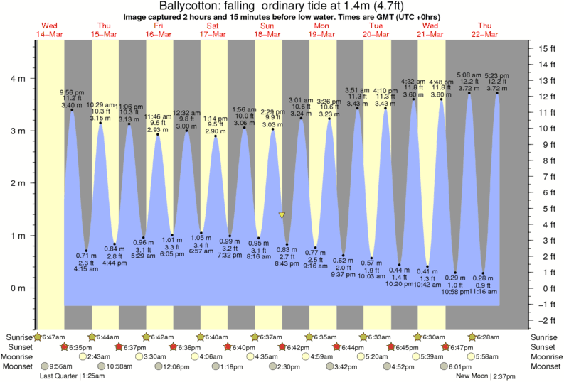 Image captured 2 hours and 15 minutes before low water (falling ordinary tide). Tide height was 1.4m (4.7 ft). Range 4.61m (15.1 ft). Toggle tide graph