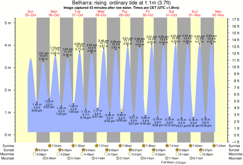 Image captured 43 minutes after low water (rising ordinary tide). Tide height was 1.1m (3.7 ft). Range 4.65m (15.3 ft). Toggle tide graph