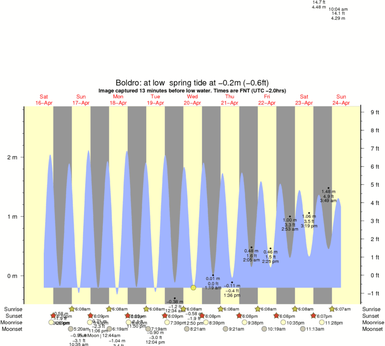 Image captured 13 minutes before low water (at low spring tide). Tide height was -0.2m (-0.6 ft). Range 2.78m (9.1 ft). Toggle tide graph