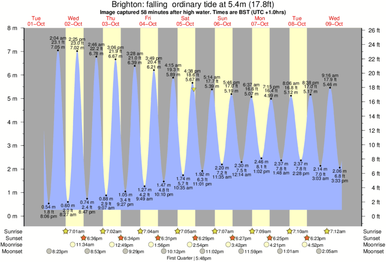 Image captured 58 minutes after high water (falling ordinary tide). Tide height was 5.4m (17.8 ft). Range 7.03m (23.1 ft). Toggle tide graph