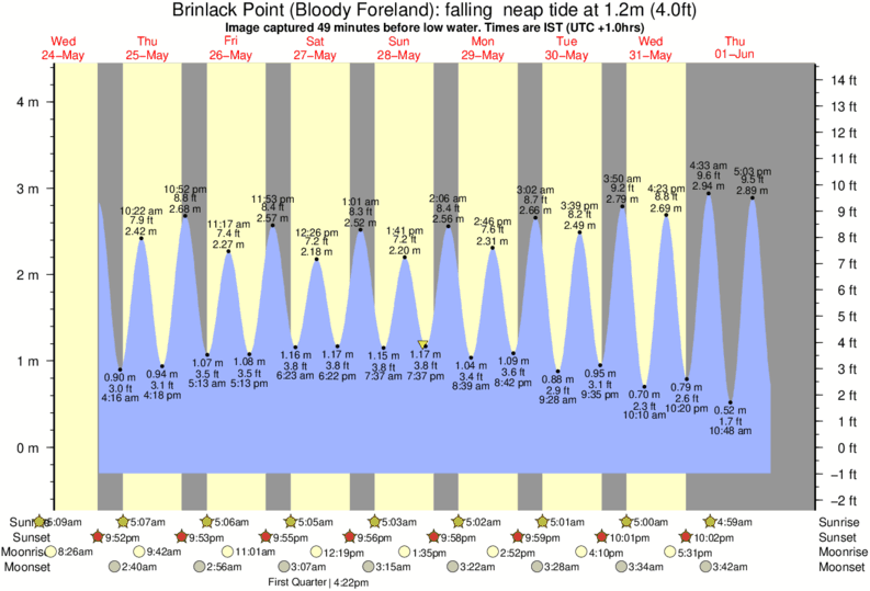 Image captured 49 minutes before low water (falling neap tide). Tide height was 1.2m (4.0 ft). Range 4.32m (14.2 ft). Toggle tide graph