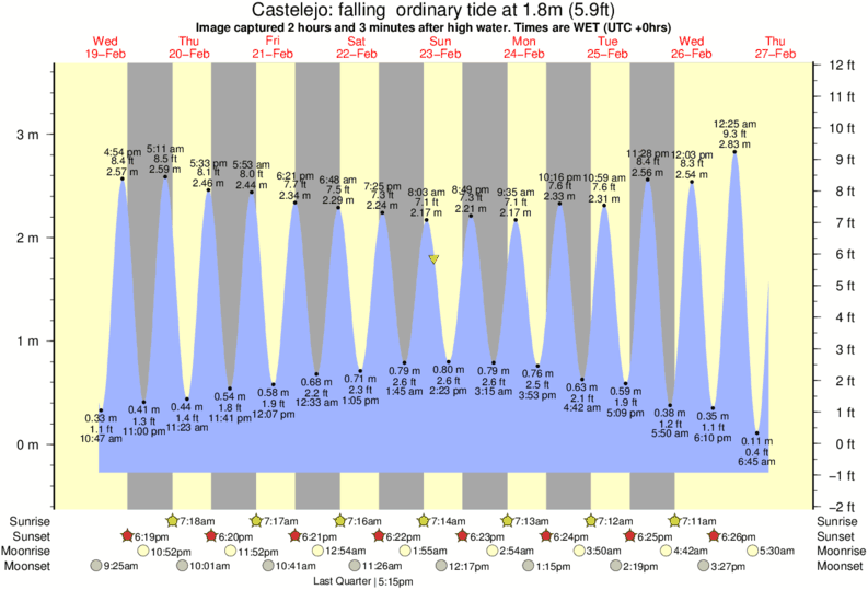 Image captured 2 hours and 3 minutes after high water (falling ordinary tide). Tide height was 1.8m (5.9 ft). Range 3.60m (11.8 ft). Toggle tide graph