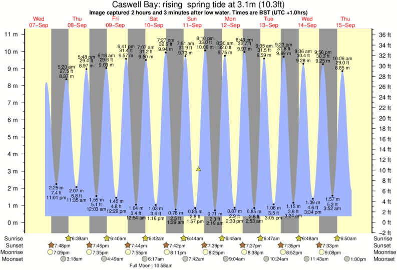Image captured 2 hours and 3 minutes after low water (rising spring tide). Tide height was 3.1m (10.3 ft). Range 9.96m (32.7 ft). Toggle tide graph
