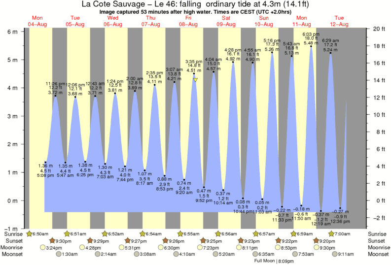 Image captured 53 minutes after high water (falling ordinary tide). Tide height was 4.3m (14.1 ft). Range 5.95m (19.5 ft). Toggle tide graph