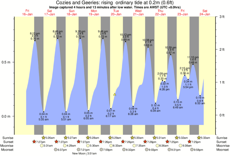 Image captured 4 hours and 13 minutes after low water (rising ordinary tide). Tide height was 0.2m (0.6 ft). Range 0.91m (3.0 ft). Toggle tide graph