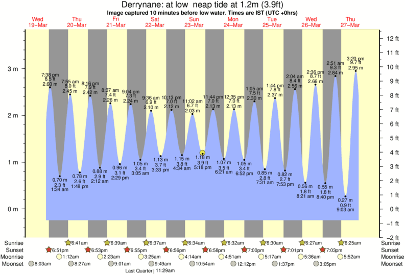 Image captured 10 minutes before low water (at low neap tide). Tide height was 1.2m (3.9 ft). Range 3.71m (12.2 ft). Toggle tide graph