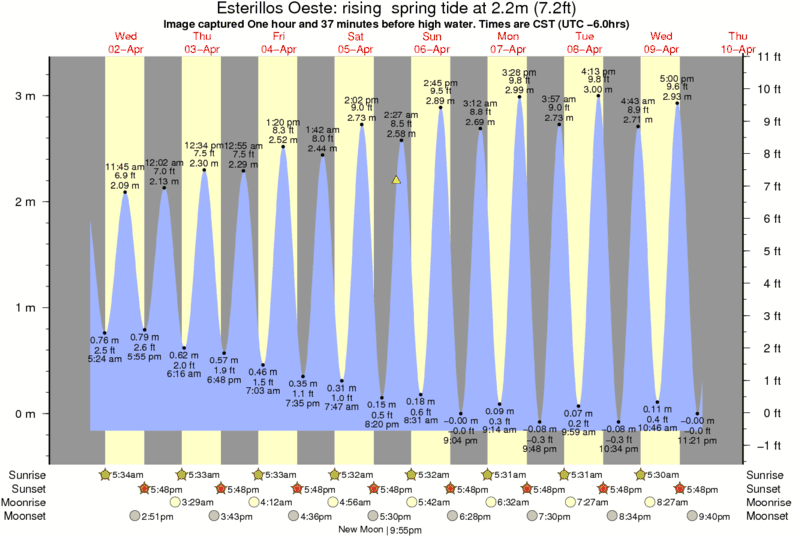 Image captured One hour and 37 minutes before high water (rising spring tide). Tide height was 2.2m (7.2 ft). Range 3.21m (10.5 ft). Toggle tide graph
