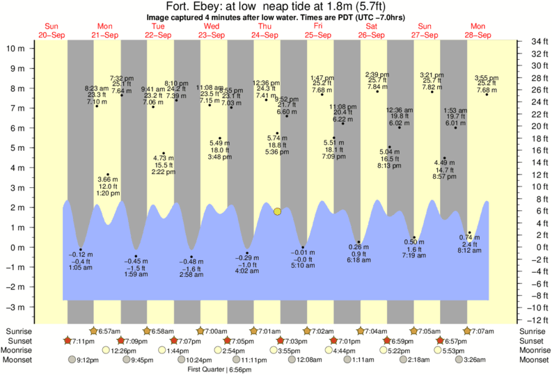 Image captured 4 minutes after low water (at low neap tide). Tide height was 1.8m (5.7 ft). Range 11.91m (39.1 ft). Toggle tide graph