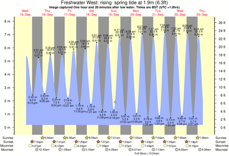 Image captured One hour and 20 minutes after low water (rising spring tide). Tide height was 1.9m (6.3 ft). Range 7.43m (24.4 ft). Toggle tide graph