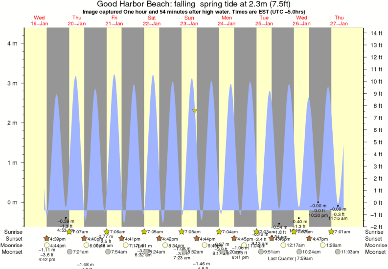 Image captured One hour and 54 minutes after high water (falling spring tide). Tide height was 2.3m (7.5 ft). Range 4.18m (13.7 ft). Toggle tide graph