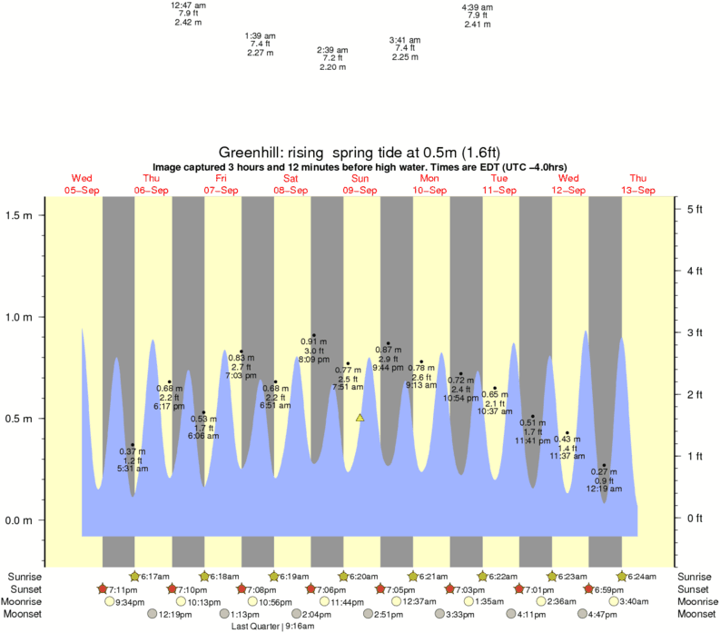 Image captured 3 hours and 12 minutes before high water (rising spring tide). Tide height was 0.5m (1.6 ft). Range 1.52m (5.0 ft). Toggle tide graph