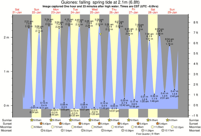 Image captured One hour and 23 minutes after high water (falling spring tide). Tide height was 2.1m (6.8 ft). Range 2.52m (8.3 ft). Toggle tide graph