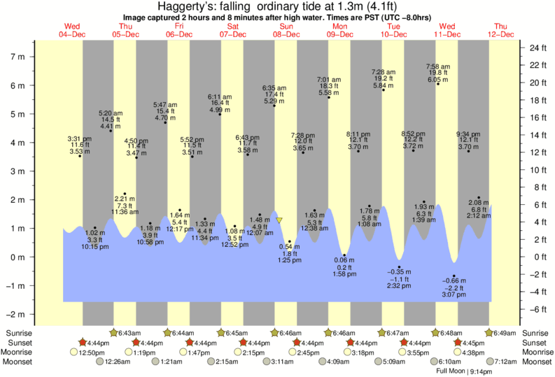 Image captured 2 hours and 8 minutes after high water (falling ordinary tide). Tide height was 1.3m (4.1 ft). Range 8.32m (27.3 ft). Toggle tide graph