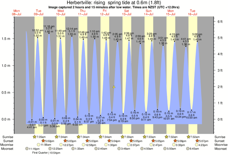 Image captured 2 hours and 15 minutes after low water (rising spring tide). Tide height was 0.6m (1.8 ft). Range 1.82m (6.0 ft). Toggle tide graph