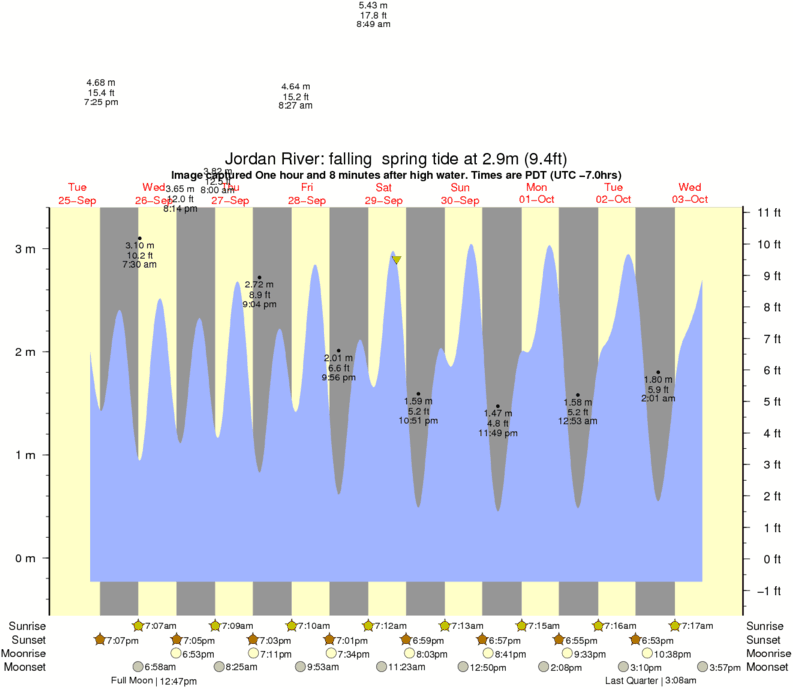 Image captured One hour and 8 minutes after high water (falling spring tide). Tide height was 2.9m (9.4 ft). Range 3.30m (10.8 ft). Toggle tide graph