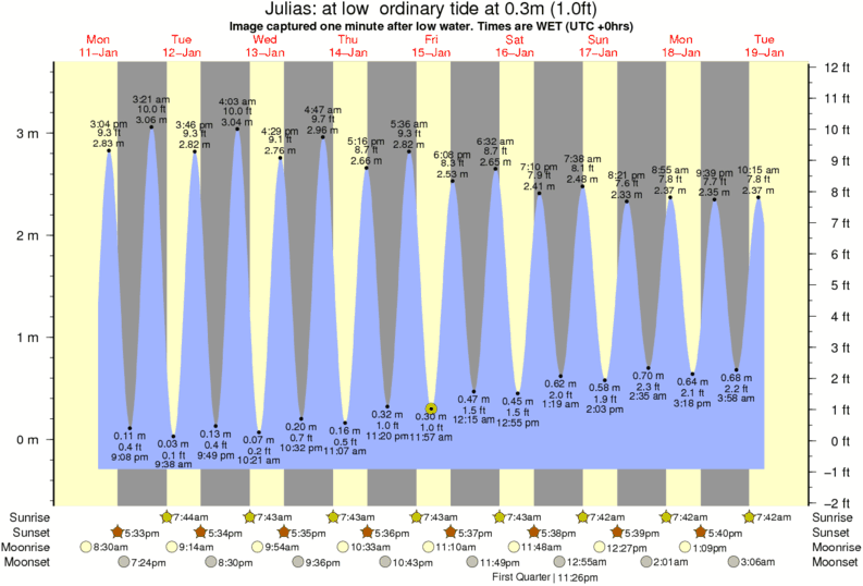 Image captured one minute after low water (at low ordinary tide). Tide height was 0.3m (1.0 ft). Range 3.63m (11.9 ft). Toggle tide graph