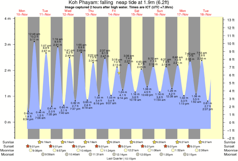 Image captured 2 hours after high water (falling neap tide). Tide height was 1.9m (6.2 ft). Range 3.93m (12.9 ft). Toggle tide graph