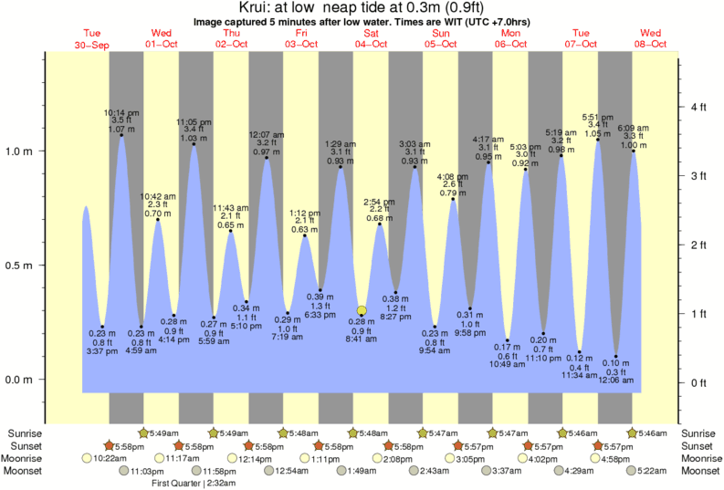Image captured 5 minutes after low water (at low neap tide). Tide height was 0.3m (0.9 ft). Range 1.36m (4.5 ft). Toggle tide graph