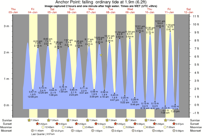Image captured 2 hours and one minute after high water (falling ordinary tide). Tide height was 1.9m (6.2 ft). Range 3.27m (10.7 ft). Toggle tide graph