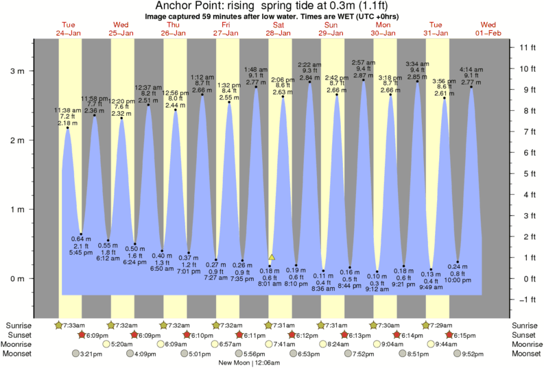 Image captured 59 minutes after low water (rising spring tide). Tide height was 0.3m (1.1 ft). Range 3.37m (11.1 ft). Toggle tide graph