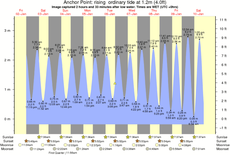 Image captured 2 hours and 33 minutes after low water (rising ordinary tide). Tide height was 1.2m (4.0 ft). Range 3.33m (10.9 ft). Toggle tide graph