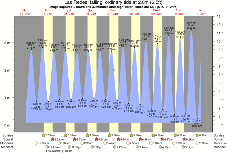 Image captured 2 hours and 32 minutes after high water (falling ordinary tide). Tide height was 2.0m (6.5 ft). Range 3.53m (11.6 ft). Toggle tide graph