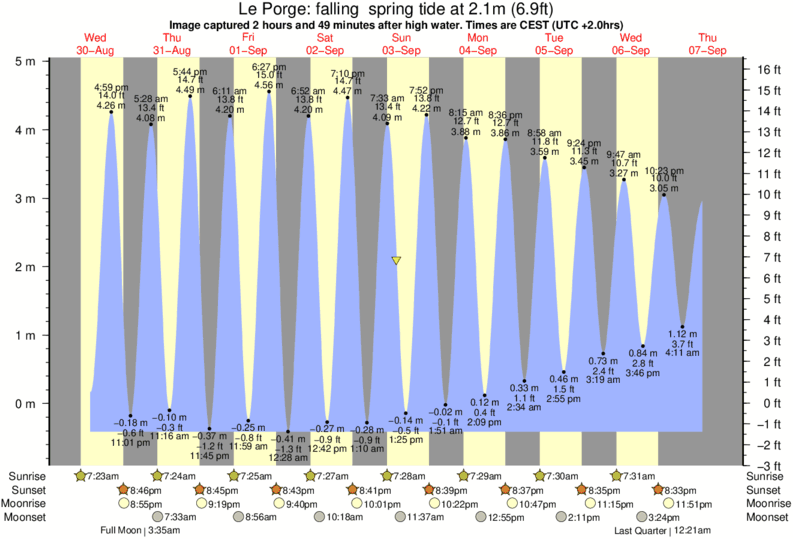Image captured 2 hours and 49 minutes after high water (falling spring tide). Tide height was 2.1m (6.9 ft). Range 4.97m (16.3 ft). Toggle tide graph