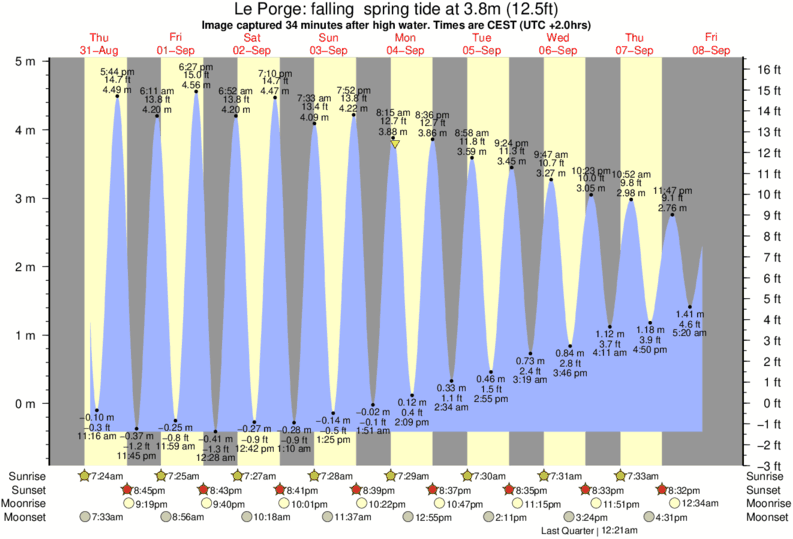 Image captured 34 minutes after high water (falling spring tide). Tide height was 3.8m (12.5 ft). Range 4.97m (16.3 ft). Toggle tide graph