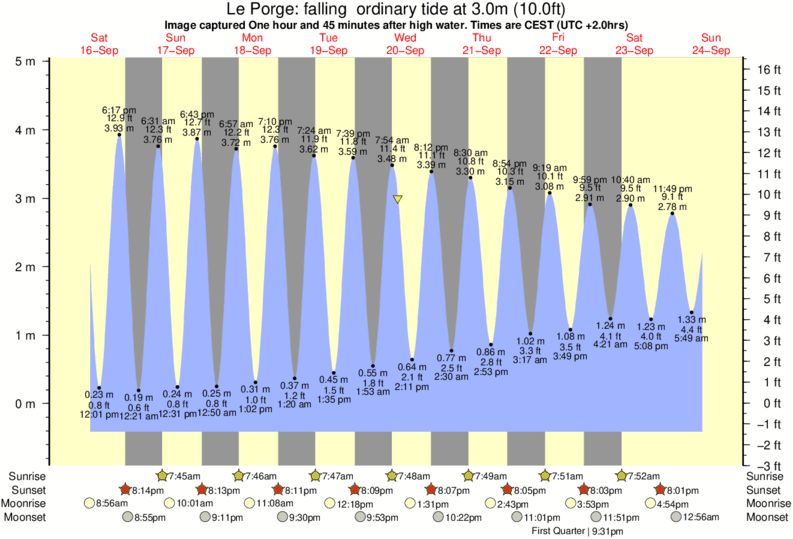 Image captured One hour and 45 minutes after high water (falling ordinary tide). Tide height was 3.0m (10.0 ft). Range 4.97m (16.3 ft). Toggle tide graph