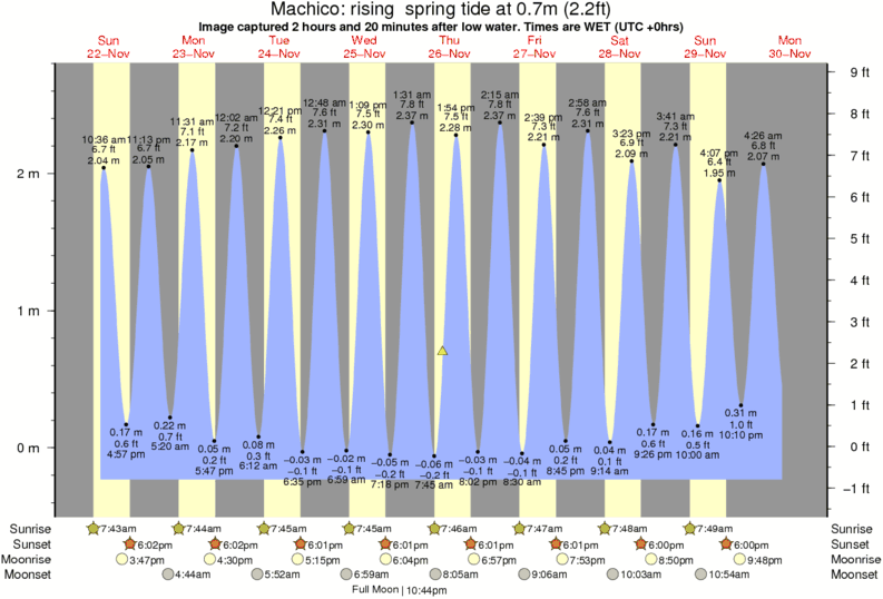 Image captured 2 hours and 20 minutes after low water (rising spring tide). Tide height was 0.7m (2.2 ft). Range 2.76m (9.1 ft). Toggle tide graph