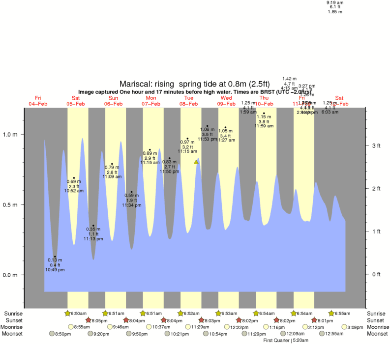 Image captured One hour and 17 minutes before high water (rising spring tide). Tide height was 0.8m (2.5 ft). Range 1.19m (3.9 ft). Toggle tide graph