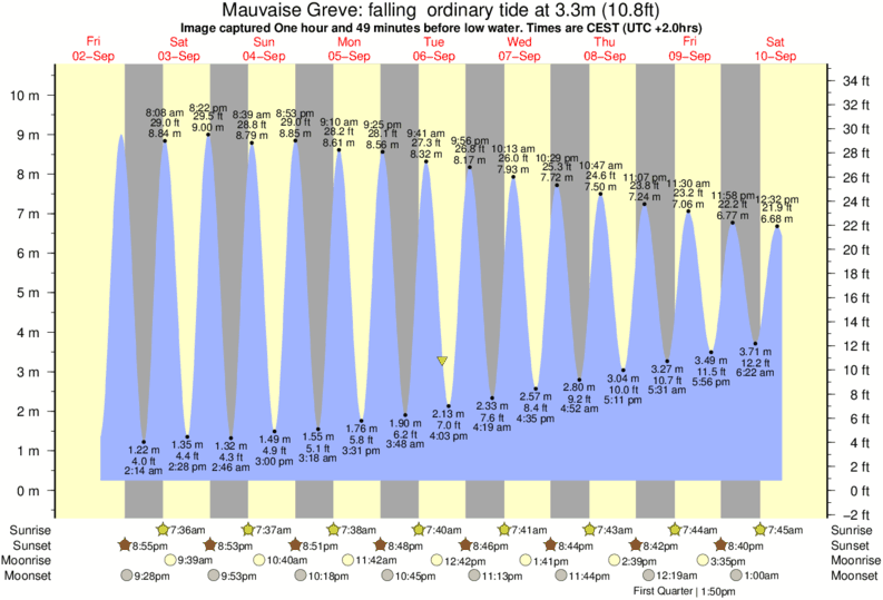 Image captured One hour and 49 minutes before low water (falling ordinary tide). Tide height was 3.3m (10.8 ft). Range 9.58m (31.4 ft). Toggle tide graph