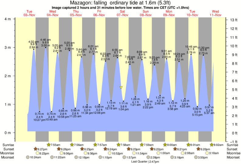 Image captured 2 hours and 31 minutes before low water (falling ordinary tide). Tide height was 1.6m (5.3 ft). Range 3.64m (11.9 ft). Toggle tide graph