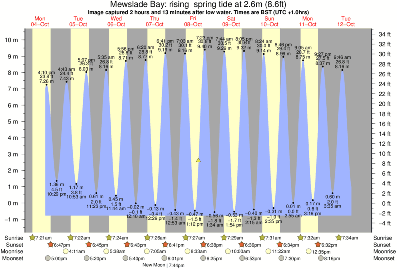 Image captured 2 hours and 13 minutes after low water (rising spring tide). Tide height was 2.6m (8.6 ft). Range 10.43m (34.2 ft). Toggle tide graph
