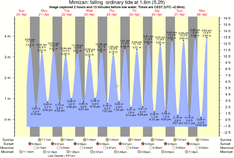 Image captured 2 hours and 13 minutes before low water (falling ordinary tide). Tide height was 1.6m (5.2 ft). Range 4.81m (15.8 ft). Toggle tide graph
