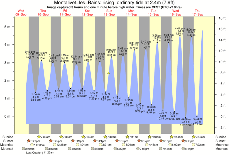 Image captured 3 hours and one minute before high water (rising ordinary tide). Tide height was 2.4m (7.9 ft). Range 5.46m (17.9 ft). Toggle tide graph