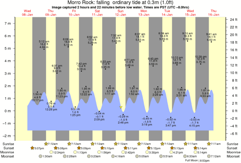 Image captured 2 hours and 22 minutes before low water (falling ordinary tide). Tide height was 0.3m (1.0 ft). Range 8.25m (27.1 ft). Toggle tide graph