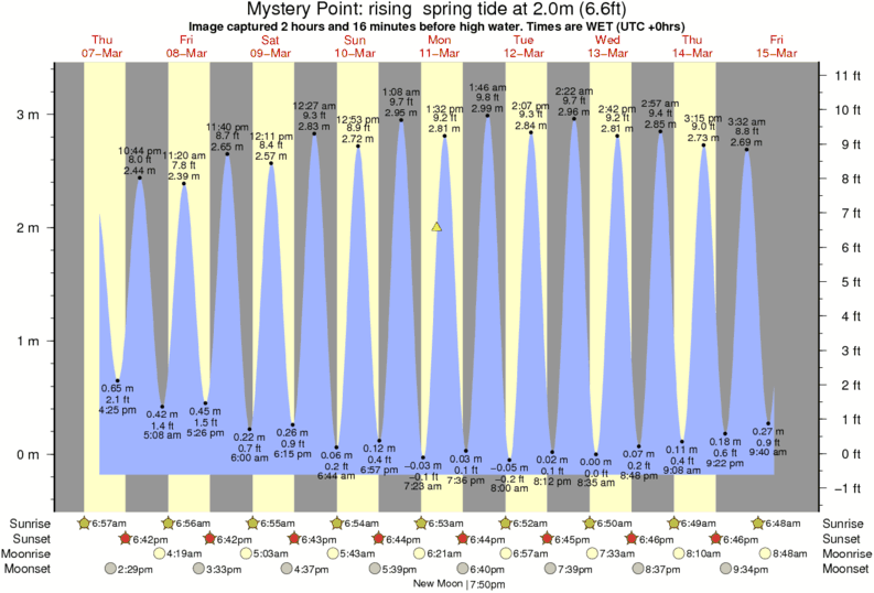Image captured 2 hours and 16 minutes before high water (rising spring tide). Tide height was 2.0m (6.6 ft). Range 3.31m (10.9 ft). Toggle tide graph