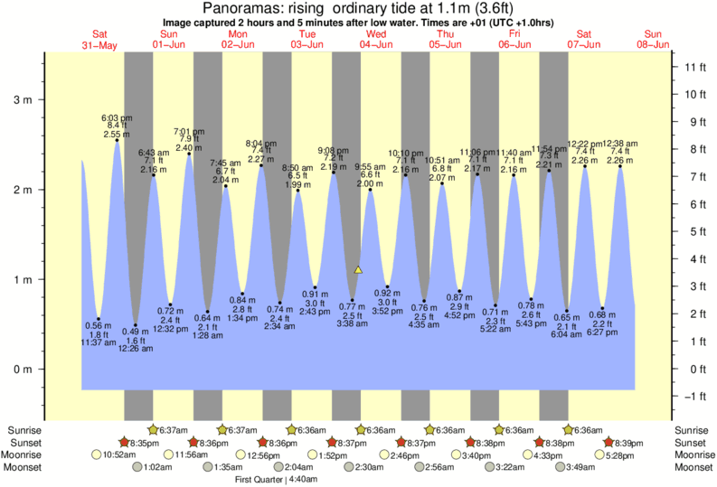 Image captured 2 hours and 5 minutes after low water (rising ordinary tide). Tide height was 1.1m (3.6 ft). Range 3.42m (11.2 ft). Toggle tide graph