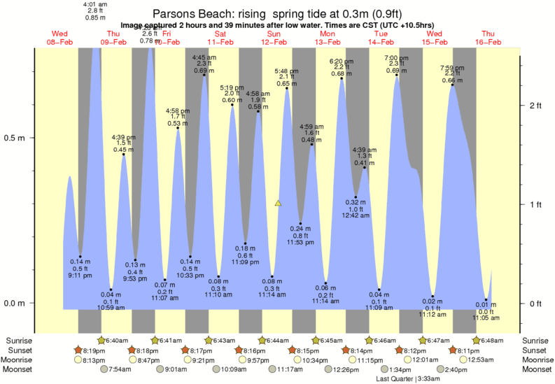 Image captured 2 hours and 39 minutes after low water (rising spring tide). Tide height was 0.3m (0.9 ft). Range 0.72m (2.4 ft). Toggle tide graph