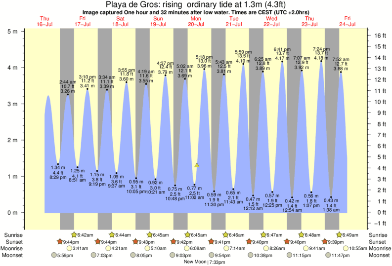 Image captured One hour and 32 minutes after low water (rising ordinary tide). Tide height was 1.3m (4.3 ft). Range 4.63m (15.2 ft). Toggle tide graph