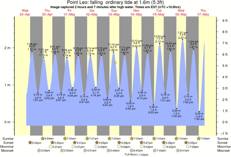 Image captured 2 hours and 7 minutes after high water (falling ordinary tide). Tide height was 1.6m (5.3 ft). Range 2.68m (8.8 ft). Toggle tide graph
