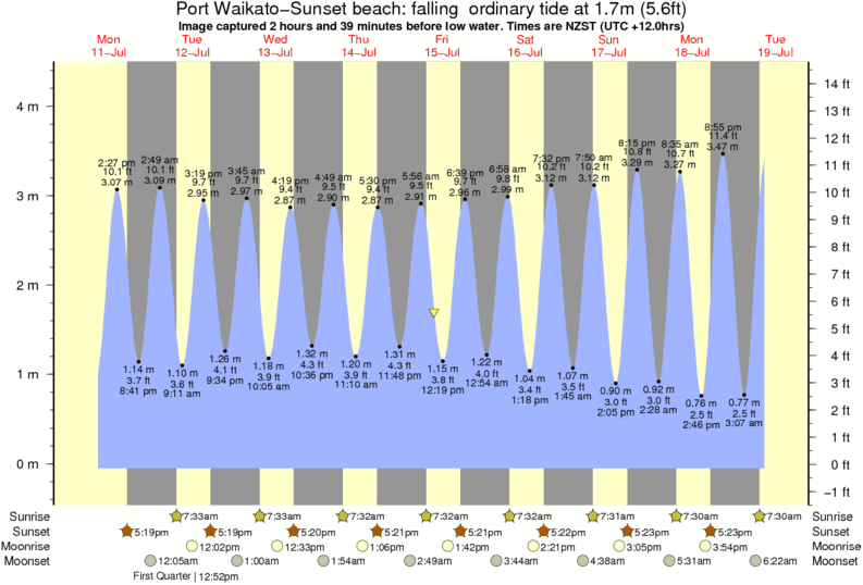 Forecast wind and swell just offshore from Port Waikato-Sunset beach around the time the photo was taken