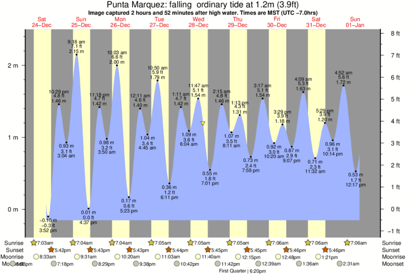 Image captured 2 hours and 52 minutes after high water (falling ordinary tide). Tide height was 1.2m (3.9 ft). Range 2.41m (7.9 ft). Toggle tide graph