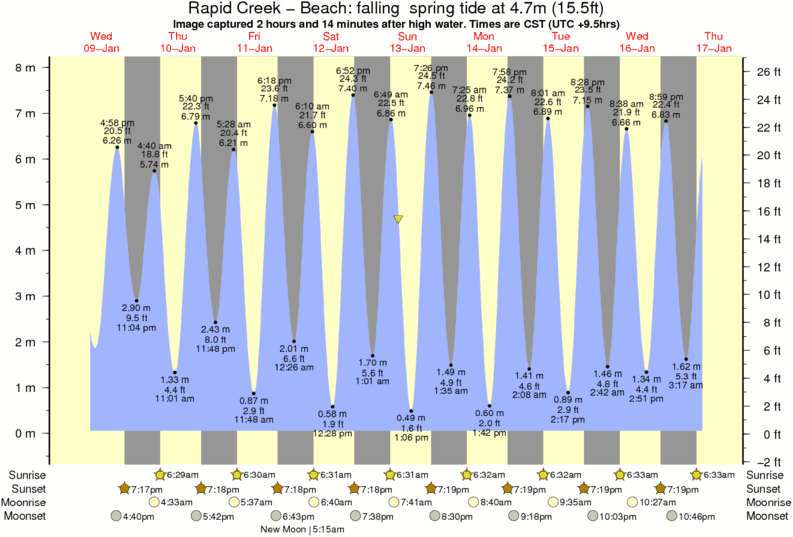 Image captured 2 hours and 14 minutes after high water (falling spring tide). Tide height was 4.7m (15.5 ft). Range 7.44m (24.4 ft). Toggle tide graph