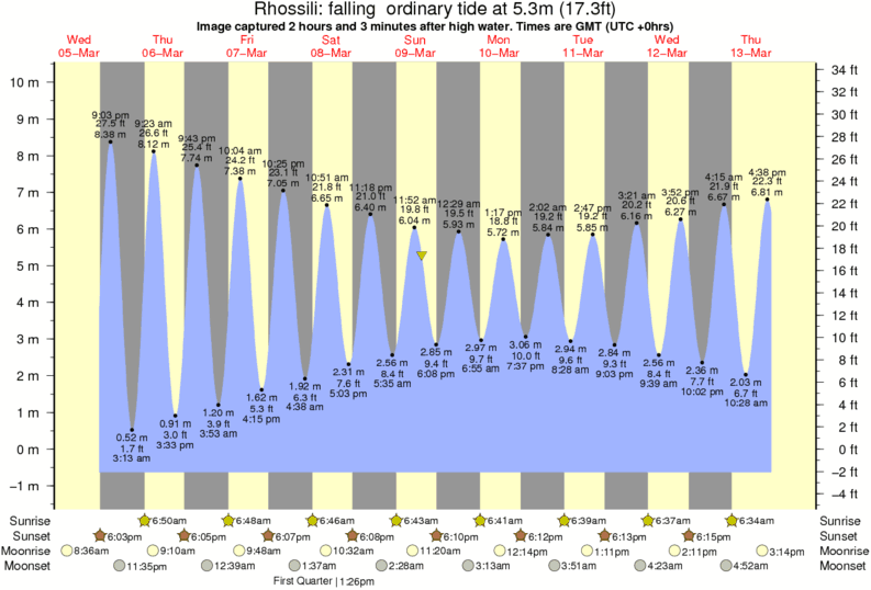Image captured 2 hours and 3 minutes after high water (falling ordinary tide). Tide height was 5.3m (17.3 ft). Range 10.17m (33.4 ft). Toggle tide graph