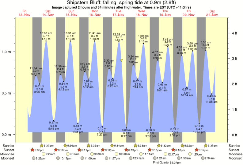 Image captured 2 hours and 34 minutes after high water (falling spring tide). Tide height was 0.9m (2.8 ft). Range 1.26m (4.1 ft). Toggle tide graph